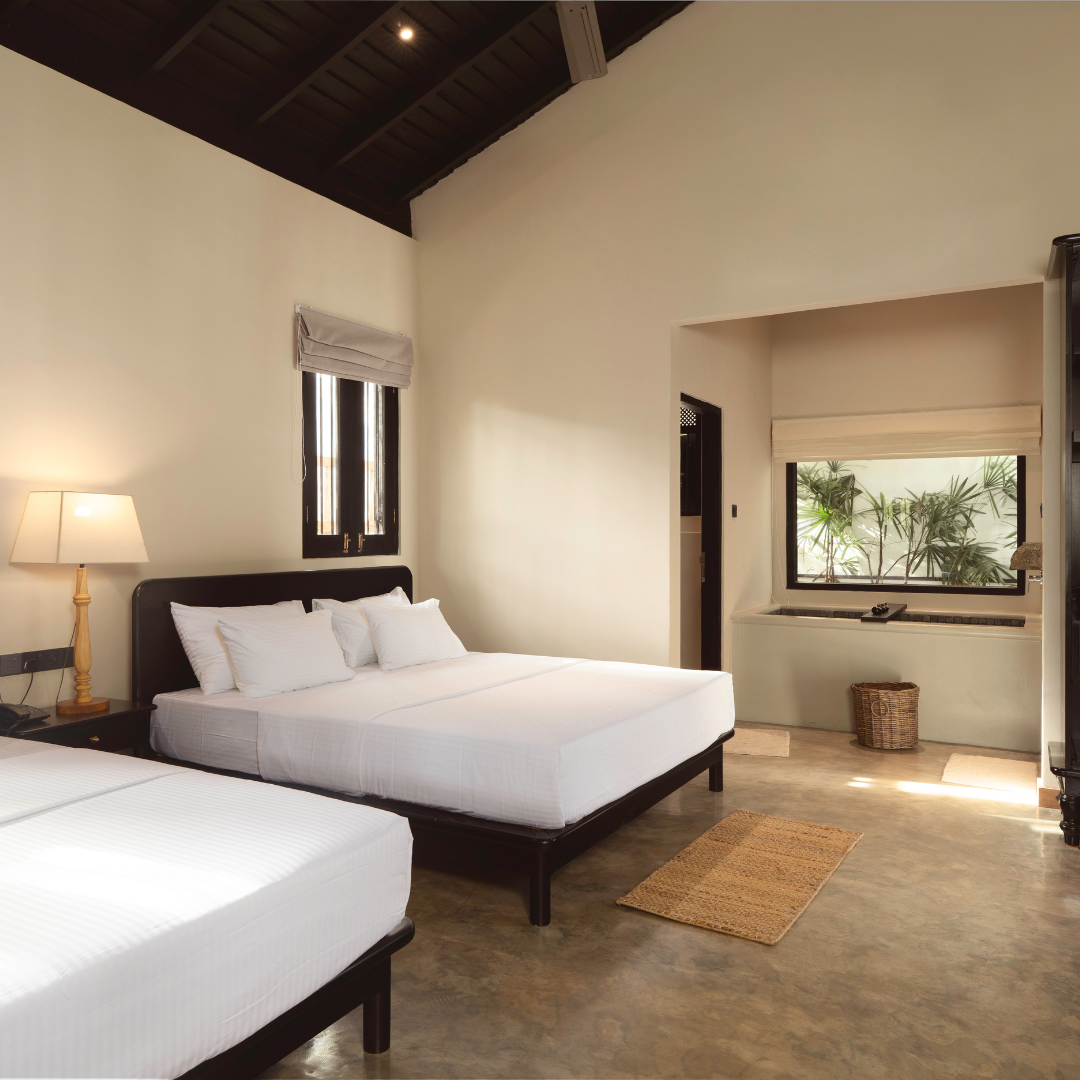 A sense of calm carries naturally into the spaces you call your own. Our three rooms are designed around comfort, ease, and the rhythm of slow living — a curated blend of modern interiors, tropical greenery, and soft island light that defines boutique accommodation in Hiriketiya. Whether you’re choosing a private bungalow with its own plunge pool or a generous suite designed for families, our Hiriketiya accommodation options provide everything needed for a relaxed, effortless beach escape. Here, time moves gently — mornings stretch unhurriedly, evenings settle softly, and each space invites you to unwind, reconnect, and enjoy the coastal pace at your own rhythm.